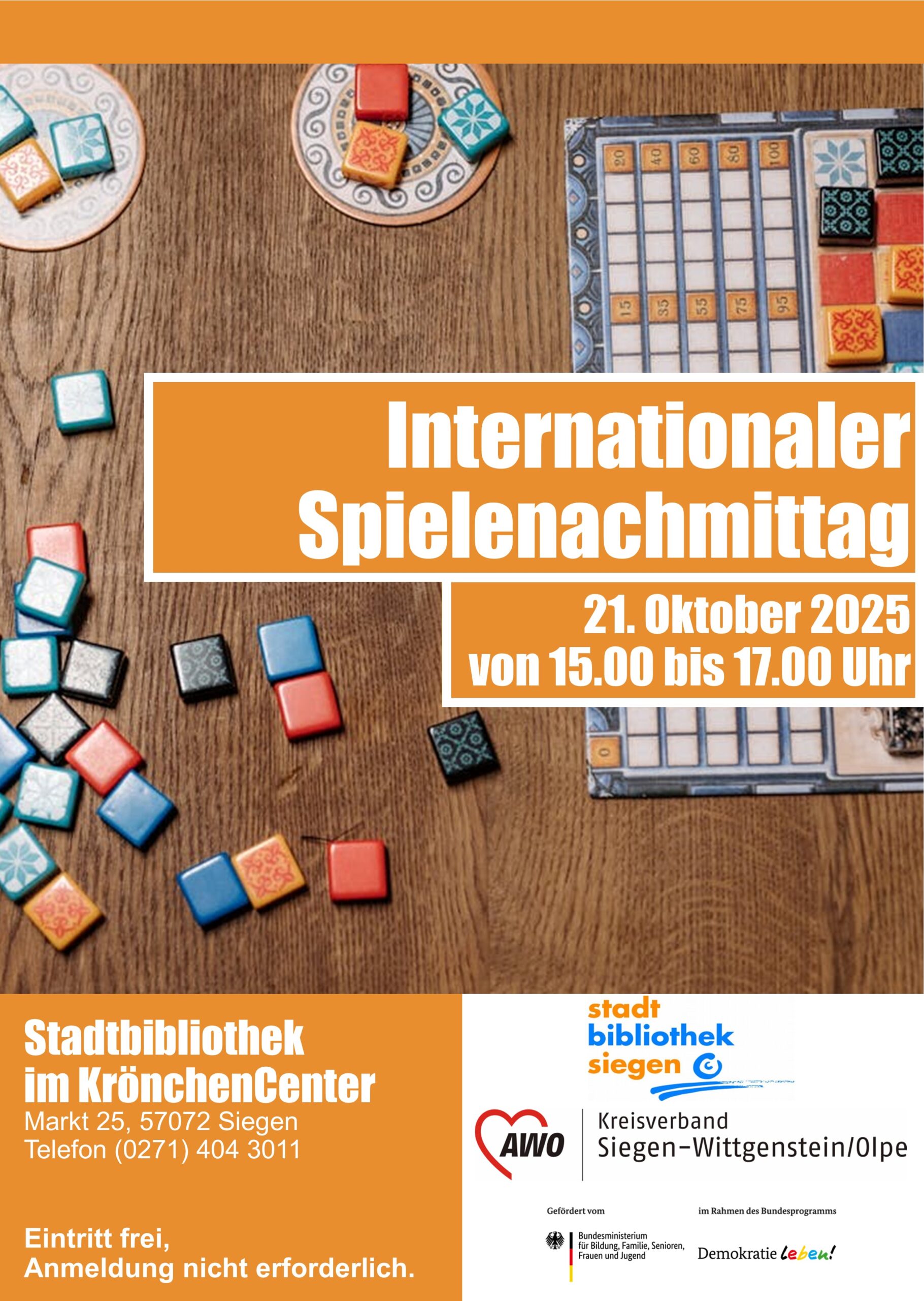 die Stadtbibliothek Siegen und die AWO Integrationsagentur laden Kinder, Familien und alle Spielebegeisterte herzlich zum 3. Internationalen Spielenachmittag in den Sommerferien ein.